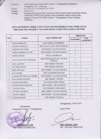 Bagi Peserta Didik yang Lulus Seleksi Berkas pada Penerimaan Peserta Didik Baru (PPDB) Jalur Prestasi untuk Mendaftar Melalui Online pada Tanggal 19 Juni 2019 di SMAN 1 TALANGPADANG Tahun Ajaran 2019/2020.