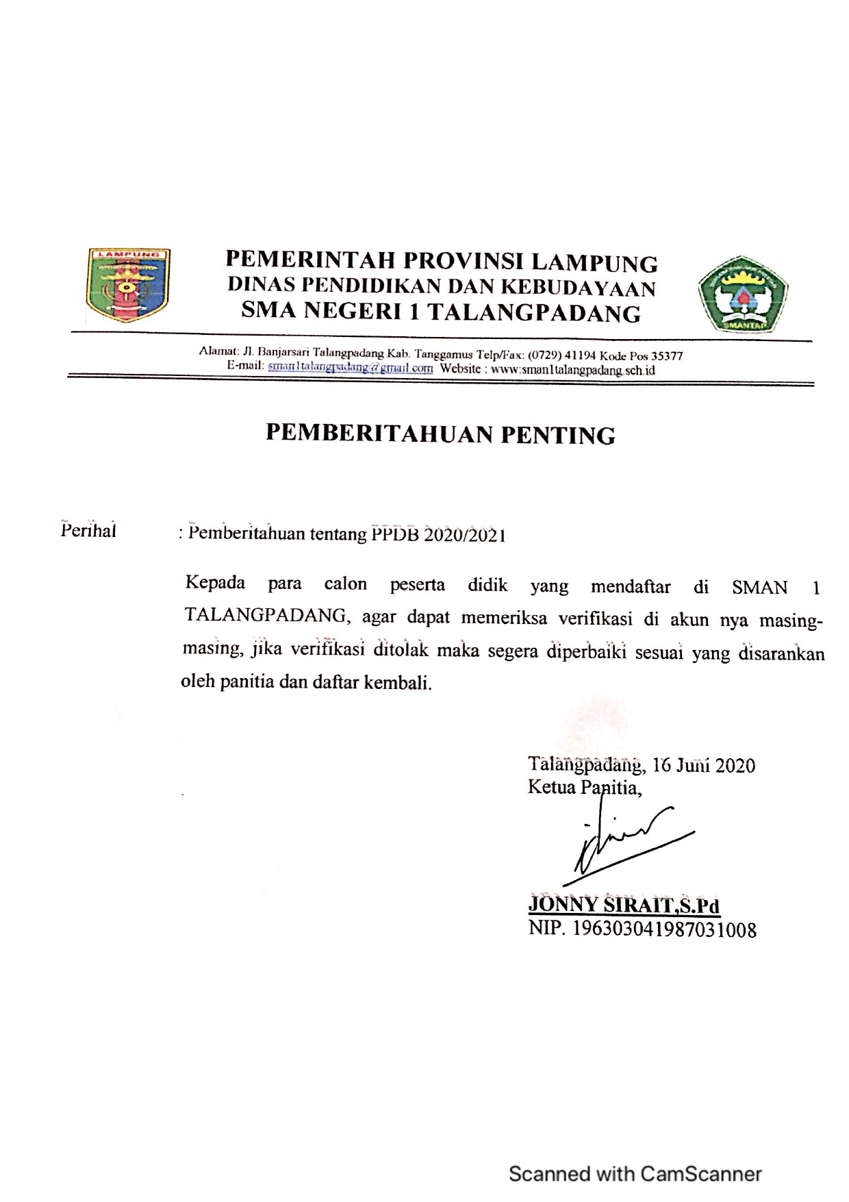 Pengumuman Penerimaan Pendaftaran Peserta Didik Baru (PPDB) SMAN 1 TALANGPADANG Tahun Ajaran 2020-2021.