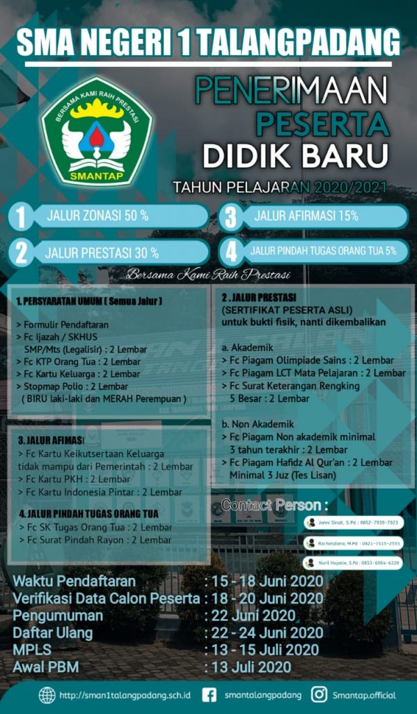 Informasi terbaru mengenai Pendaftaran Peserta Didik Baru di SMAN 1 Talangpadang, silahkan dibaca dengan teliti dan seksama. untuk informasi lebih lanjut bisa menghubungi nomer telfon yang tertera di pamflet. terimakasih